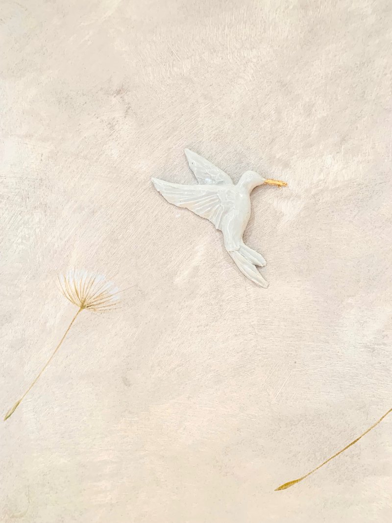 Elemento decorativo para pared realizado en porcelana, acabado en esmalte brillo y pan de oro.