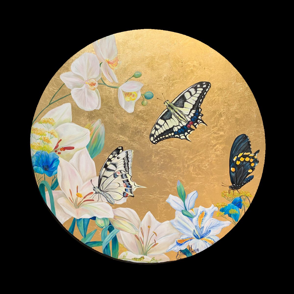 Mariposas asiáticas que a su vez están en España, junto sus plantas nutricias. 150x150cm, pan de oro y óleo sobre lienzo.