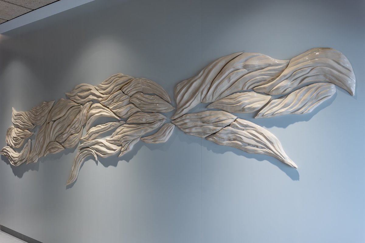 Representa la ondulación del agua. Gres de alta temperatura esmaltado en blanco.